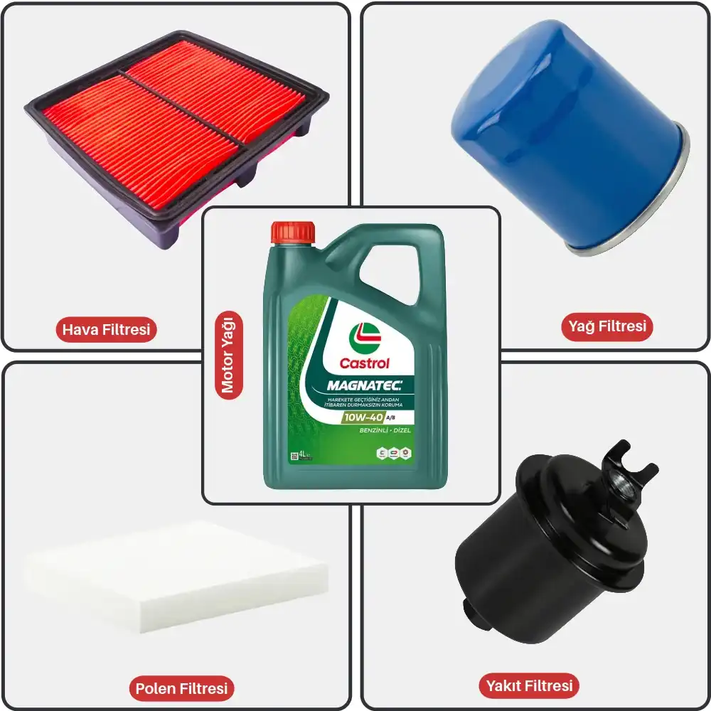 Bakım Seti içeriği; Hava Filtresi (1.6cc Motor uyumlu), Yağ Filtresi, Polen Filtresi, Yakıt Filtresi ve Motor Yağı 4 Litre Castrol Edge 10W-40 A/B